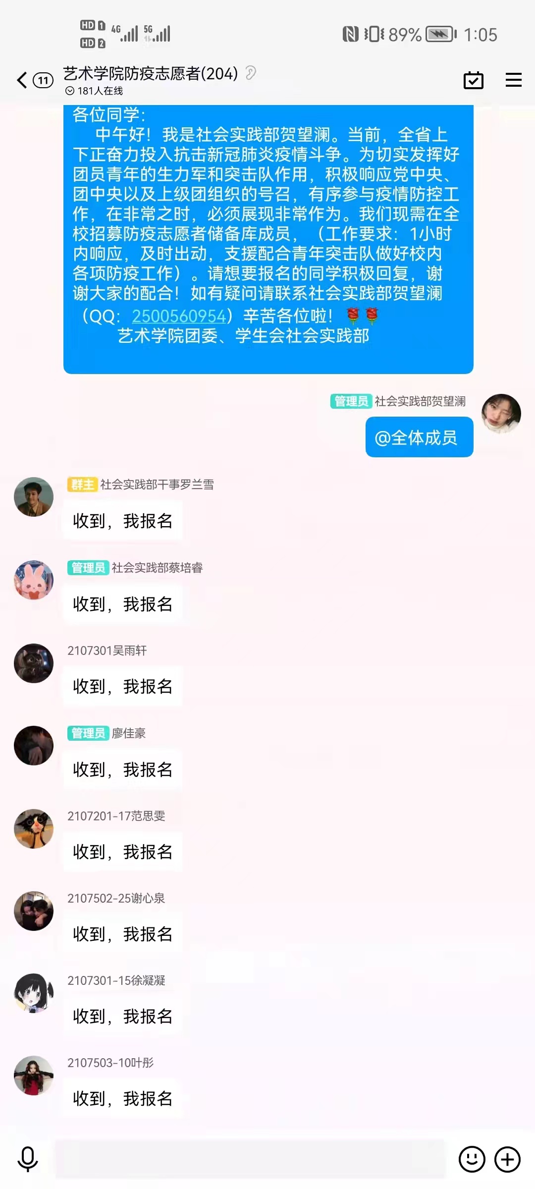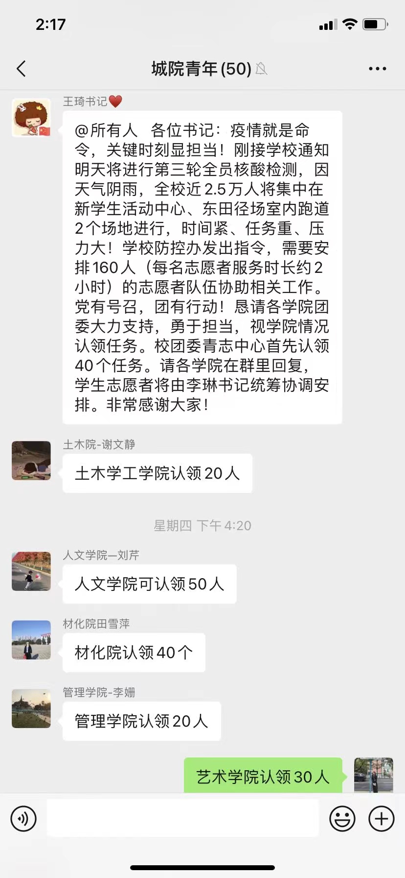 因疫情防控需要,公司近2.5万人要进行第三轮核酸检测,时间紧、任务重、压力大,为协助工作更好地开展,在“城院青年”群内,校团委书记王琦发出了“党有号召,团有行动”的志愿者招募,艺术公司第一时间主动认领40个志愿者名额,160个志愿者岗位5分钟内认领一空。325日下午13:3016:00,艺术公司志愿者们身穿红马甲,帮助医护人员传递物资、健康扫码、保持现场采集人员“一米”距离等等,保证了现场防疫工作的井然有序。