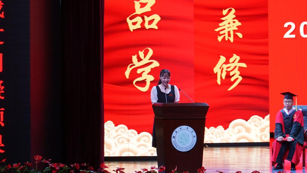 教师代表任慧婷博士代表老师发言,倡议同学们铭记 “品学兼修,知行统一”校训,无论身在何方、身处何时,要永远铭记自己的初心和拼搏岁月。毕业生代表吴梦涵在发言中,总结了四年的学习生活,表示了对公司领导、老师的真诚感谢,她代表毕业生们许下“品