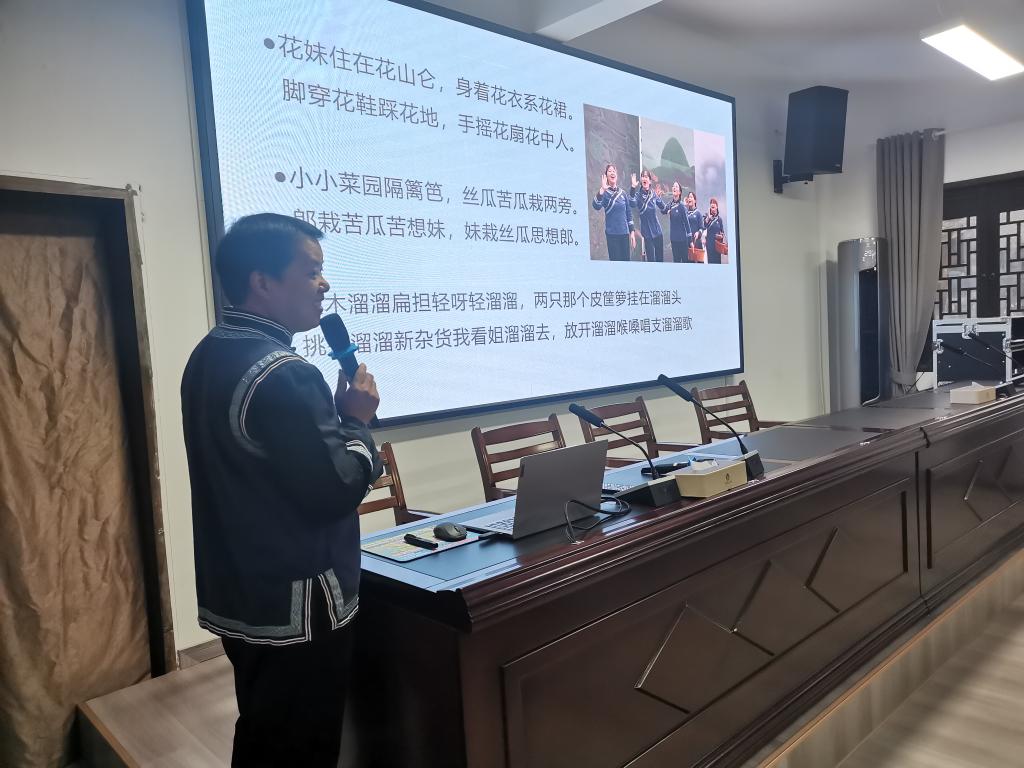 下午4点,同学们在景点工作人员的组织下,观摩了一场非常精彩的关于梅山民歌的讲学。在课堂上同学们与梅山民歌传承人进行了互动表演,气氛非常热烈。在欢快的教学活动中,同学们学到了不少关于梅山民歌的知识。