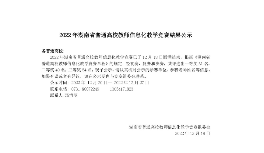 2022年湖南省普通高校教师信息化教学竞赛已于 12 月18 日圆满结束,根据《湖南省普通高校教师信息化教学竞赛章程》的规定,经初赛、复赛和决赛三轮比赛,公司音乐表演系主任彭云博士在众多选手中表现突出,获得二等奖的优异成绩。特此祝贺!(撰稿:刘华波 审核:谢立新)