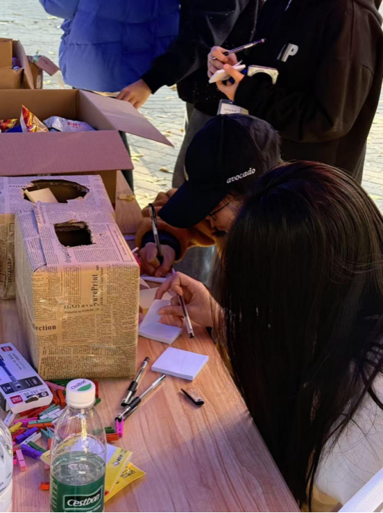 活动围绕“情绪疏导+正向传递”展开,设置“树洞盲盒”与“心愿墙”两大互动环节。“树洞盲盒”环节设有“打败坏情绪”箱与“树洞信箱”。同学们匿名书写心事,将学业压力、人际困扰等投入“坏情绪箱”,实现情绪释放;同时为陌生同学写下暖心鼓励,投入“树洞信箱”。“倾诉+鼓励”的双向模式,既疏解了负面情绪,也让善意默默流转。在“心愿墙”活动中,同学们纷纷执笔绘梦,写下“期末顺利”“成为更好的自己”“愿所念皆如愿”等真挚心愿。五彩便签渐渐贴满墙面,成为校园中一道温暖风景,记录着青春的理想与温情,也凝聚着学子之间的情感共鸣。现场参与者冯子恒表示:“活动让我感到放松,压力得到了释放,是一个难得的倾诉机会。”