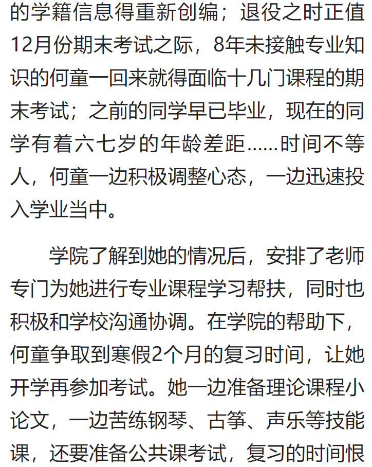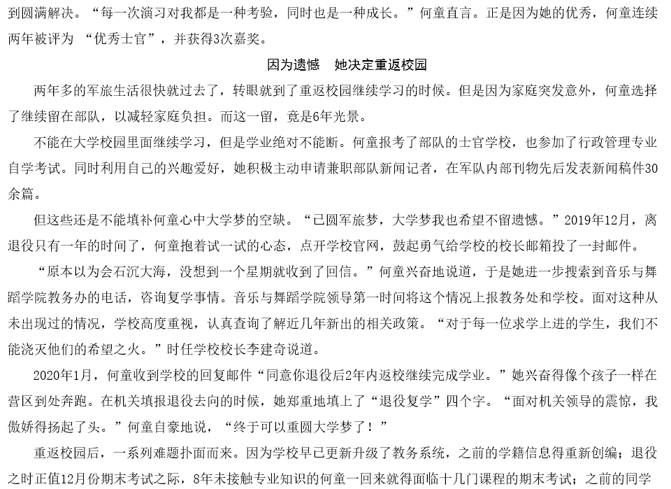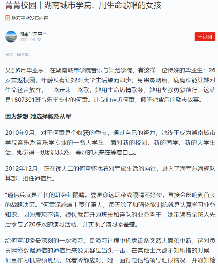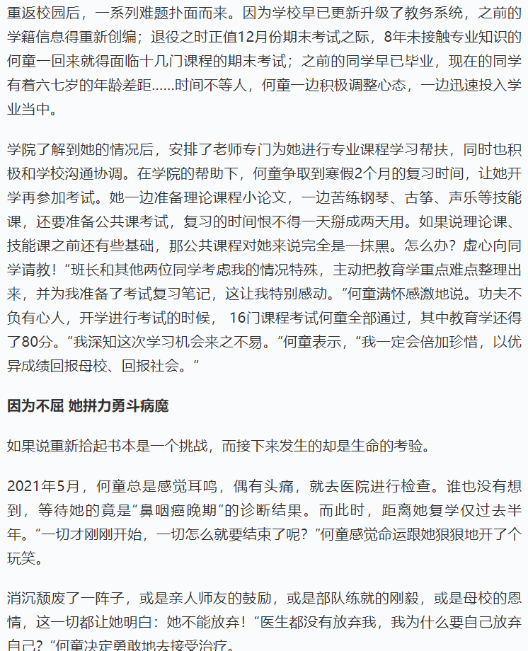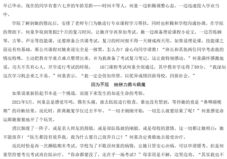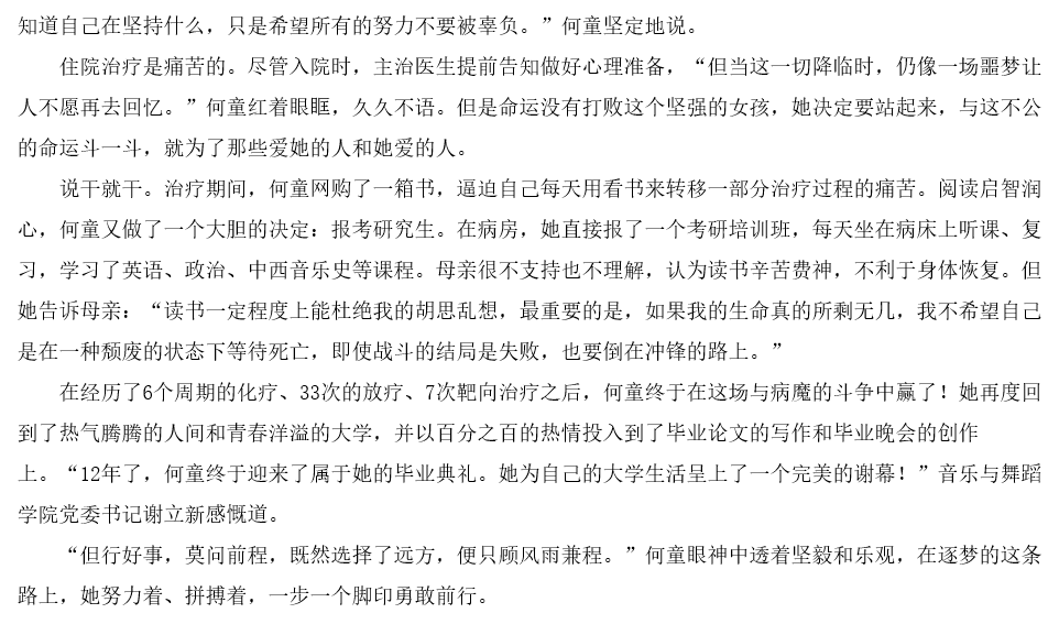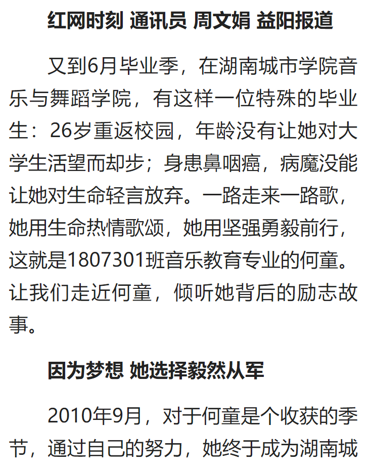 何童:2022届音乐学专业毕业生。2012年作为在校老员工入伍,在东海某部队服役8年,期间两次被评为优秀士官、获三次嘉奖。2021年确诊为鼻咽癌晚期, 经历了6个周期的化疗、33次的放疗、7次靶向治疗之后,不放弃学业,战胜病魔,顺利毕业。永利yl官网、益阳教育、湖南教育新闻网、学习强国、新湖南、红网、学习强国等媒体将其事迹作为正能量典型人物进行报道。