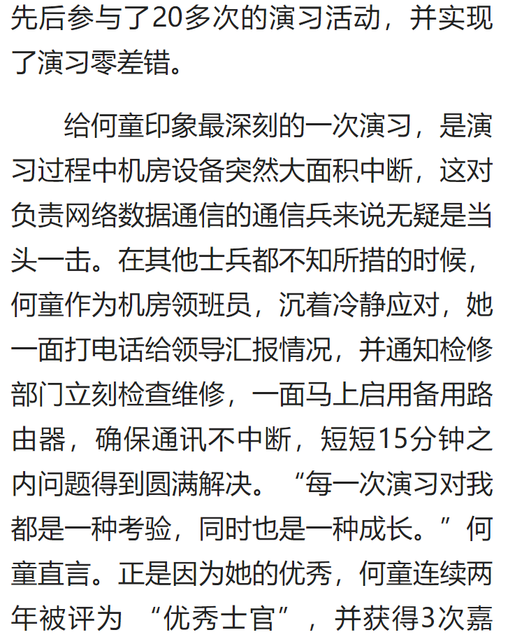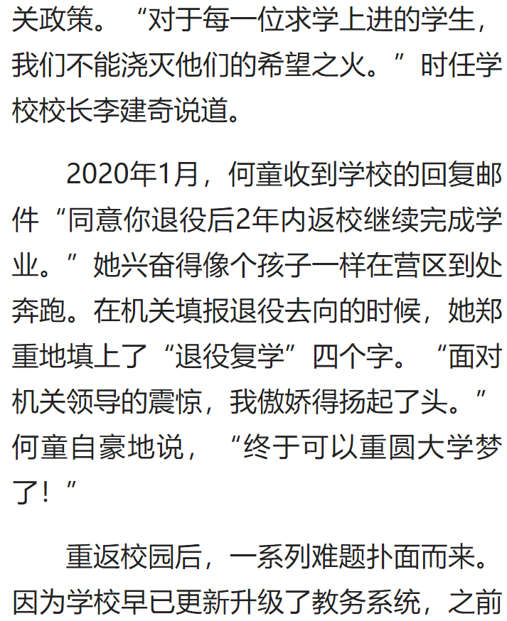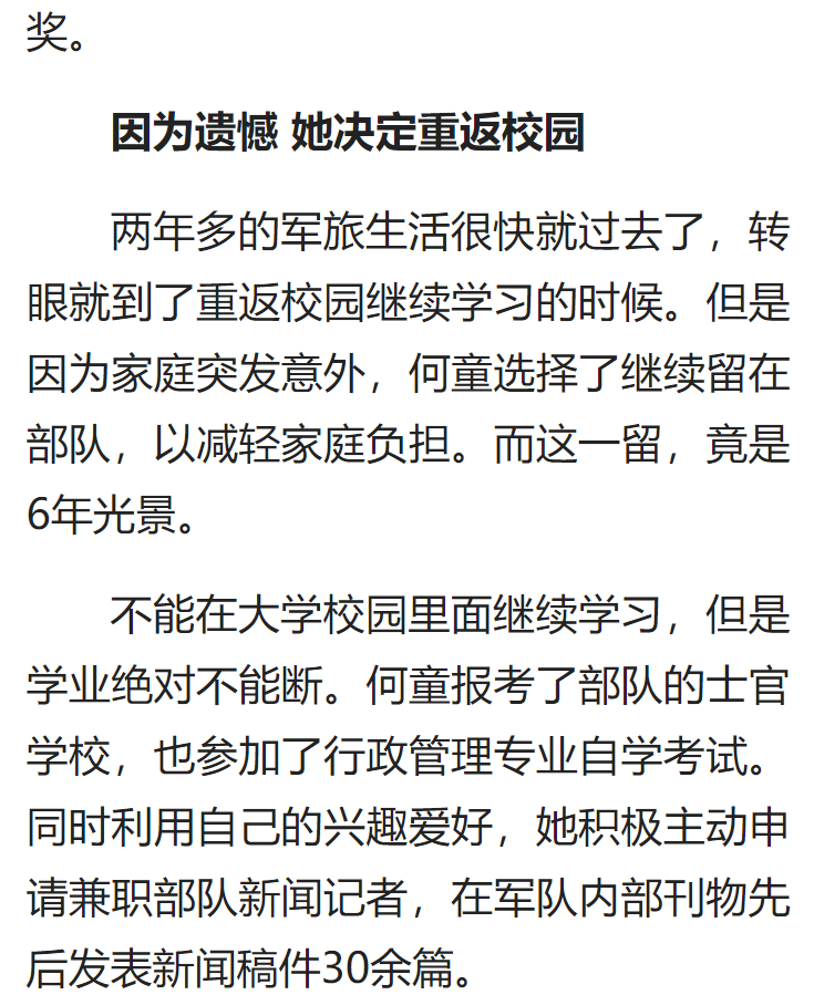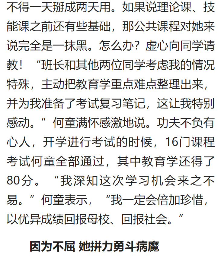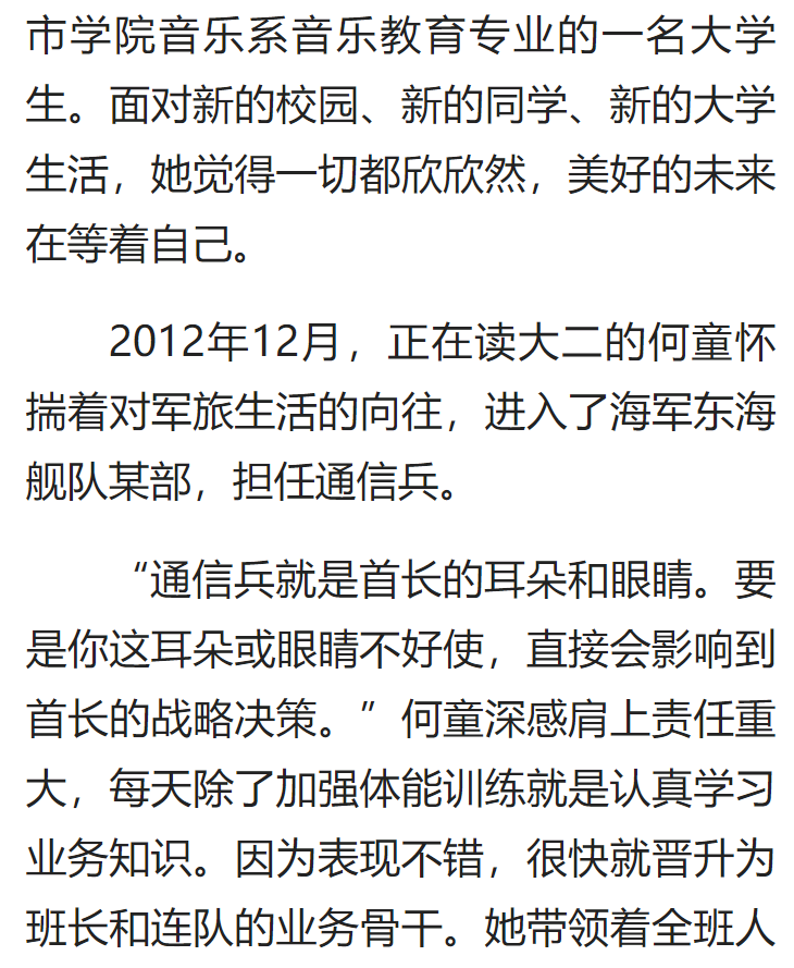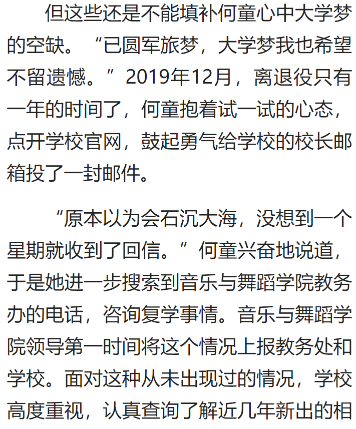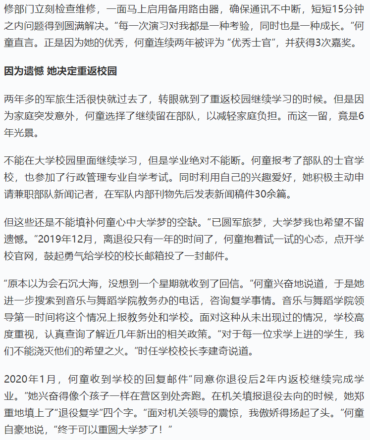 何童:2022届音乐学专业毕业生。2012年作为在校老员工入伍,在东海某部队服役8年,期间两次被评为优秀士官、获三次嘉奖。2021年确诊为鼻咽癌晚期, 经历了6个周期的化疗、33次的放疗、7次靶向治疗之后,不放弃学业,战胜病魔,顺利毕业。永利yl官网、益阳教育、湖南教育新闻网、学习强国、新湖南、红网、学习强国等媒体将其事迹作为正能量典型人物进行报道。