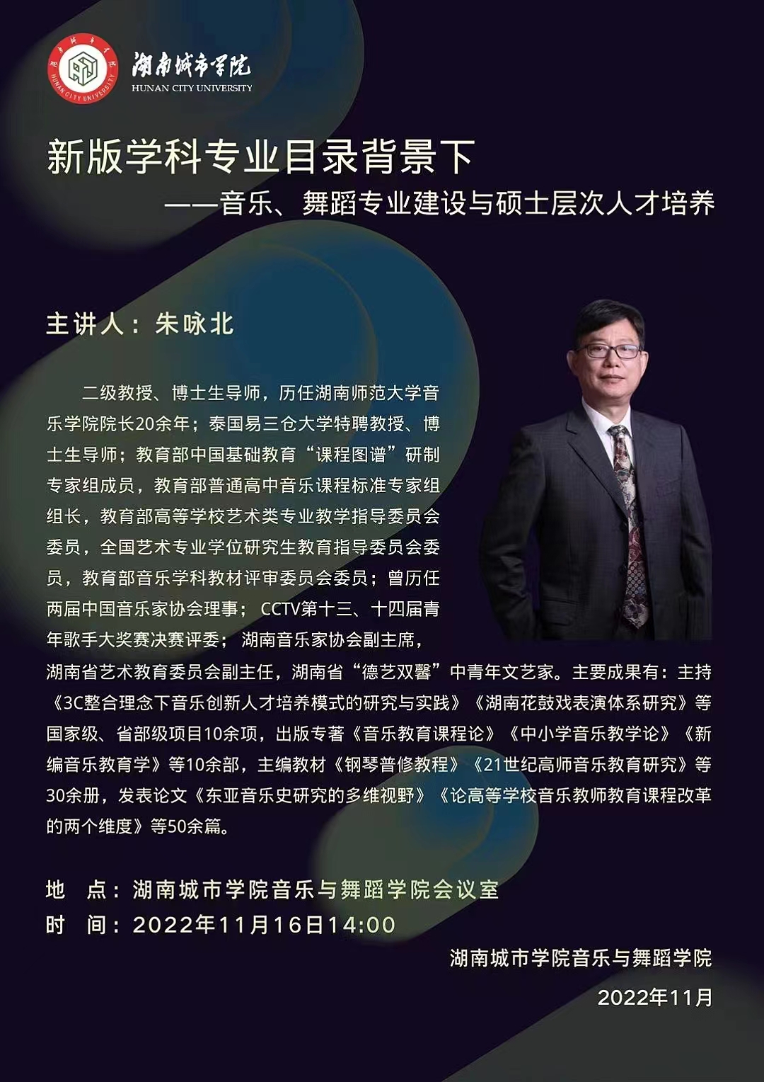11月16日下午两点,原湖南师范大学音乐公司经理朱咏北教授莅临公司,做《新学科专业目录背景下音乐、舞蹈专业建设与硕士层次人才培养》的学术讲座。