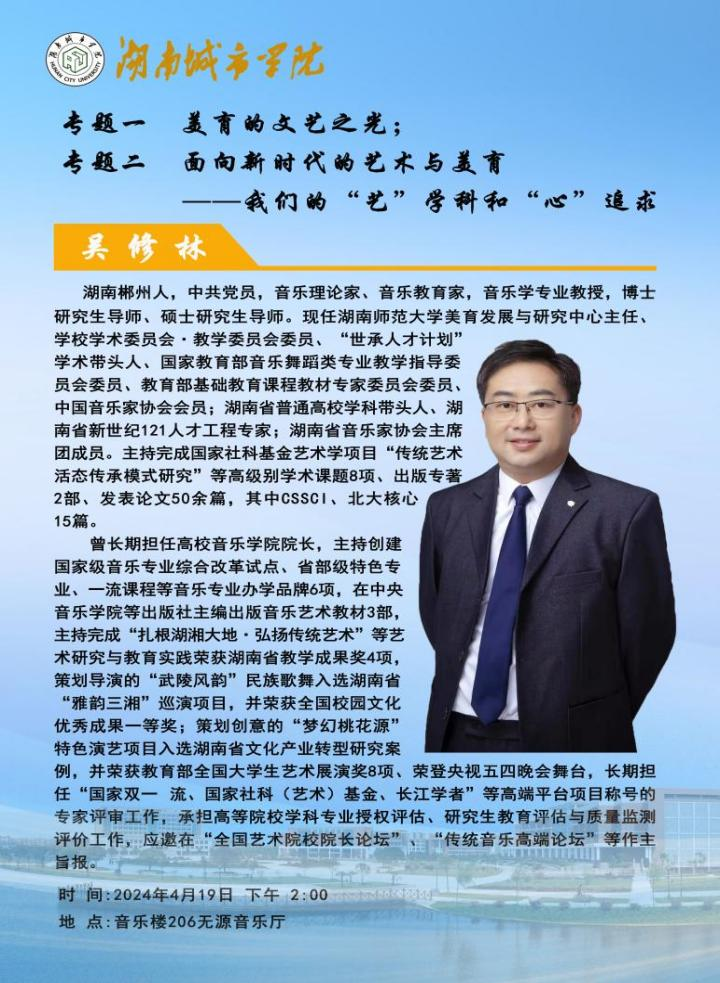 为促进公司专业团队建设发展,提高音乐学师范认证工作效率和质量,4月19日下午四点,湖南师范大学美育中心主任、博士研究生导师吴修林教授莅临公司,为全体教师做题为《面向新时代的艺术与美育——我们的“艺”学科和“心”追求》的专题学术交流,会议由曹蕙姿经理主持。